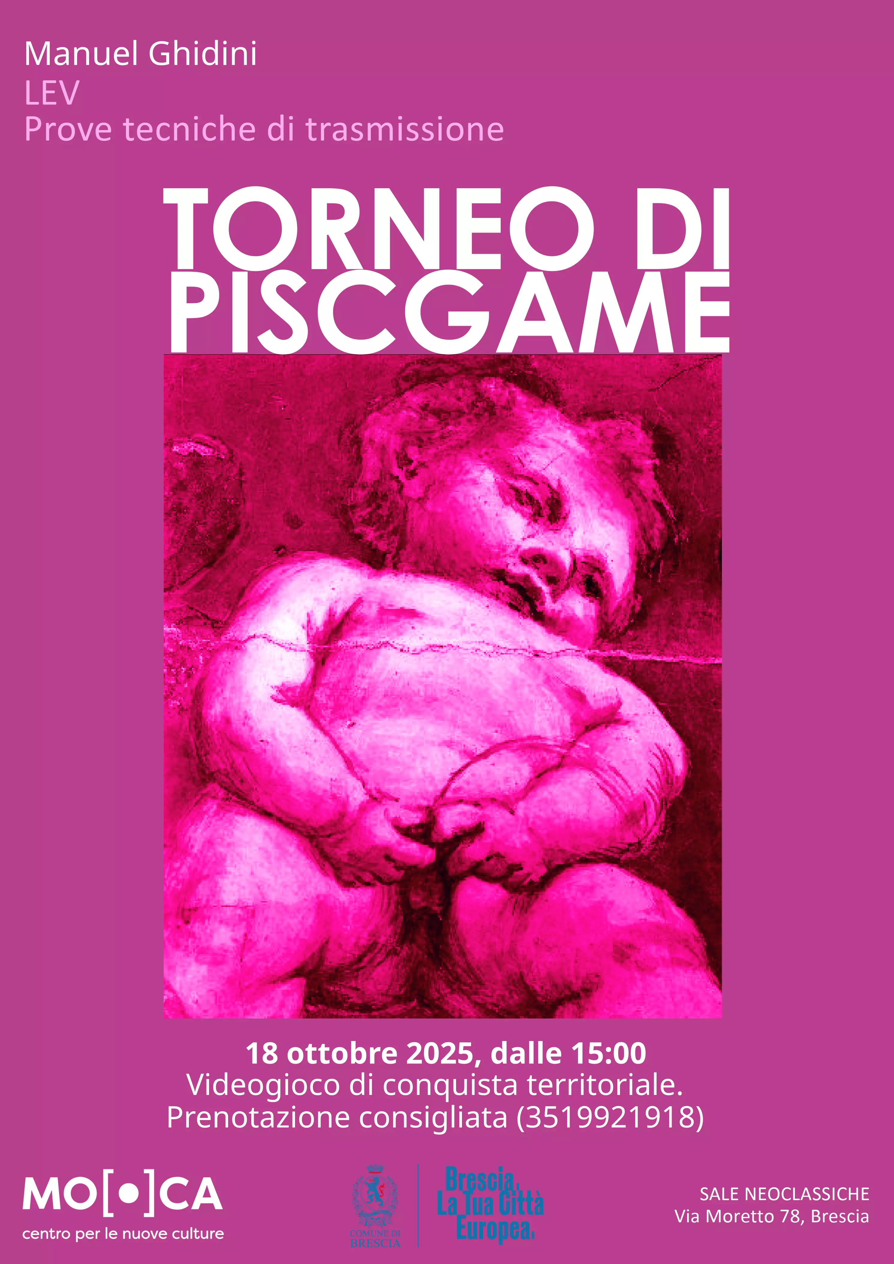 Locandina del torneo di PISCGAME in occasione della mostra collettiva Leviatano Rosa, a cura di LEV Prove tecniche di trasmissione, presso le sale neoclassiche di MO.CA - Centro per le nuove culture, Brescia